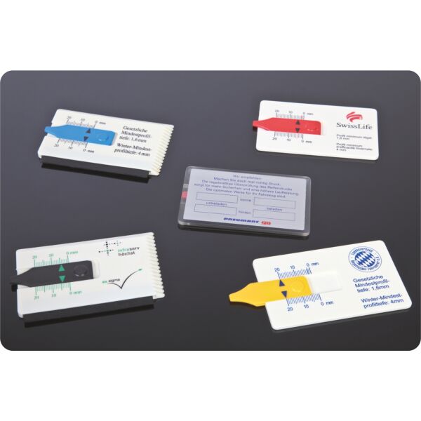 Autobandenprofieltester in creditcardformaat met gegevens over de wettelijk vereiste profielen voor zomer- enwinterbanden. Geen meerprijs voor reclamebedrukking aan de voorkant als deze in dezelfde kleur is als de schaal.(Alleen instellingskosten)Check up plus-12, als Check-up 11, met additioneel ijskrabber en trekker voor natte ruiten en buitenspiegels.Made in Germany